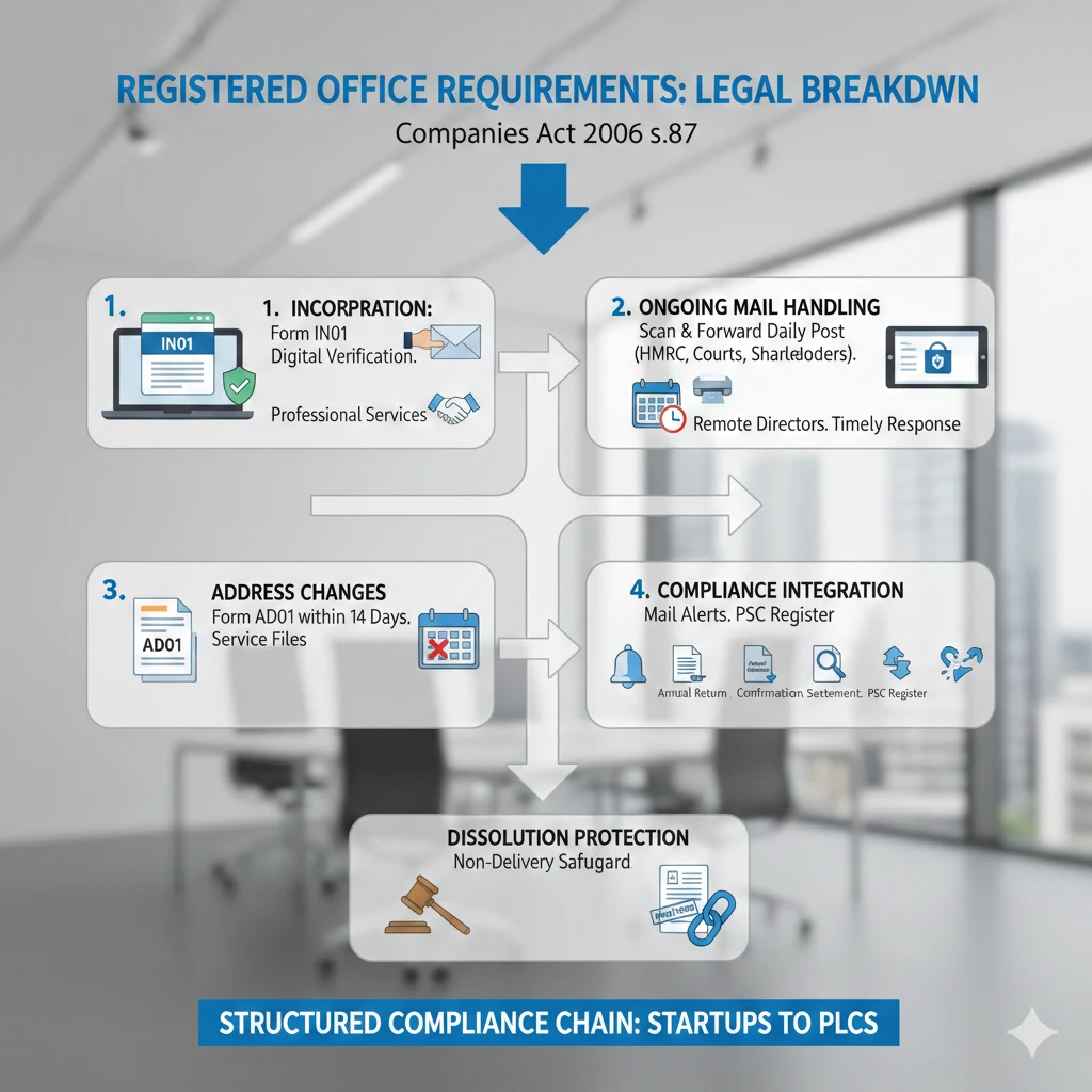 The obligation stems from Companies Act 2006 section 87, mandating every UK limited company maintain a registered office capable of receiving statutory mail during business hours. Step one during incorporation involves listing the address on form IN01, where professional services confirm acceptance instantly via digital verification, unlike personal setups requiring proof of control.
