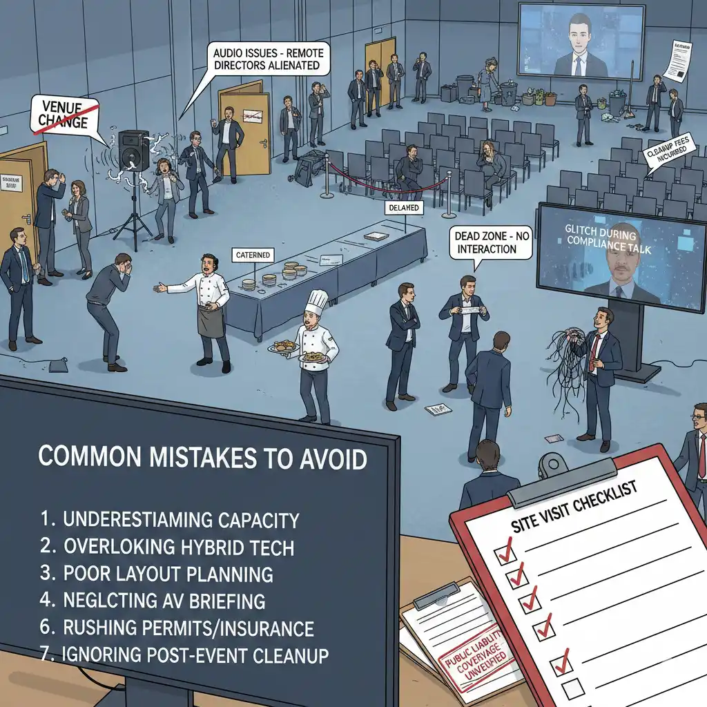 A top error is underestimating capacity, forcing last-minute venue changes that disrupt compliance timelines like AGM deadlines. Overlooking hybrid tech in large rooms leads to audio issues, alienating remote directors. Poor layout planning creates dead zones, stifling interaction on shareholder proposals.
