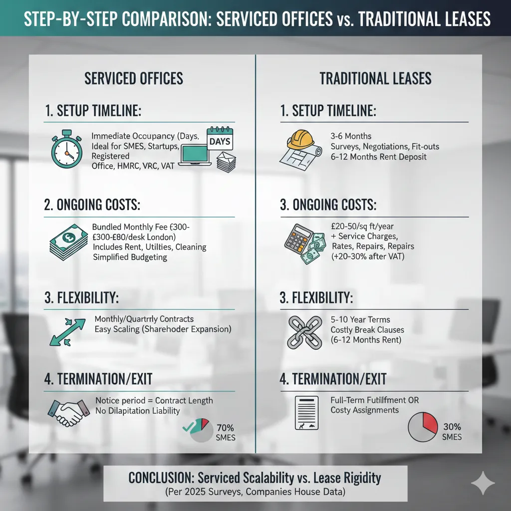 Evaluating serviced offices against traditional leases requires a structured breakdown. Assess setup timelines. Serviced offices enable immediate occupancy often within days ideal for SMEs post-incorporation needing a registered office for Companies House filings. A tech startup can book a desk, receive HMRC correspondence, and commence VAT-registered trading without delays. Traditional leases involve surveys, negotiations, and fit-outs spanning 3-6 months, plus deposits equivalent to 6-12 months’ rent.