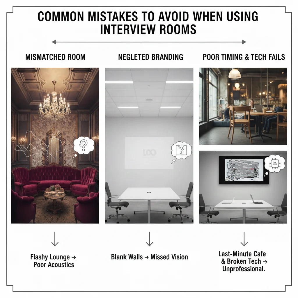 Poor timing exacerbates issues: last-minute bookings risk unavailability, forcing fallbacks to cafes that signal unreliability. Overlooking tech checks causes demo failures, frustrating IT-savvy candidates. Failing to brief reception on candidate protocols results in unprofessional greetings, eroding first impressions.