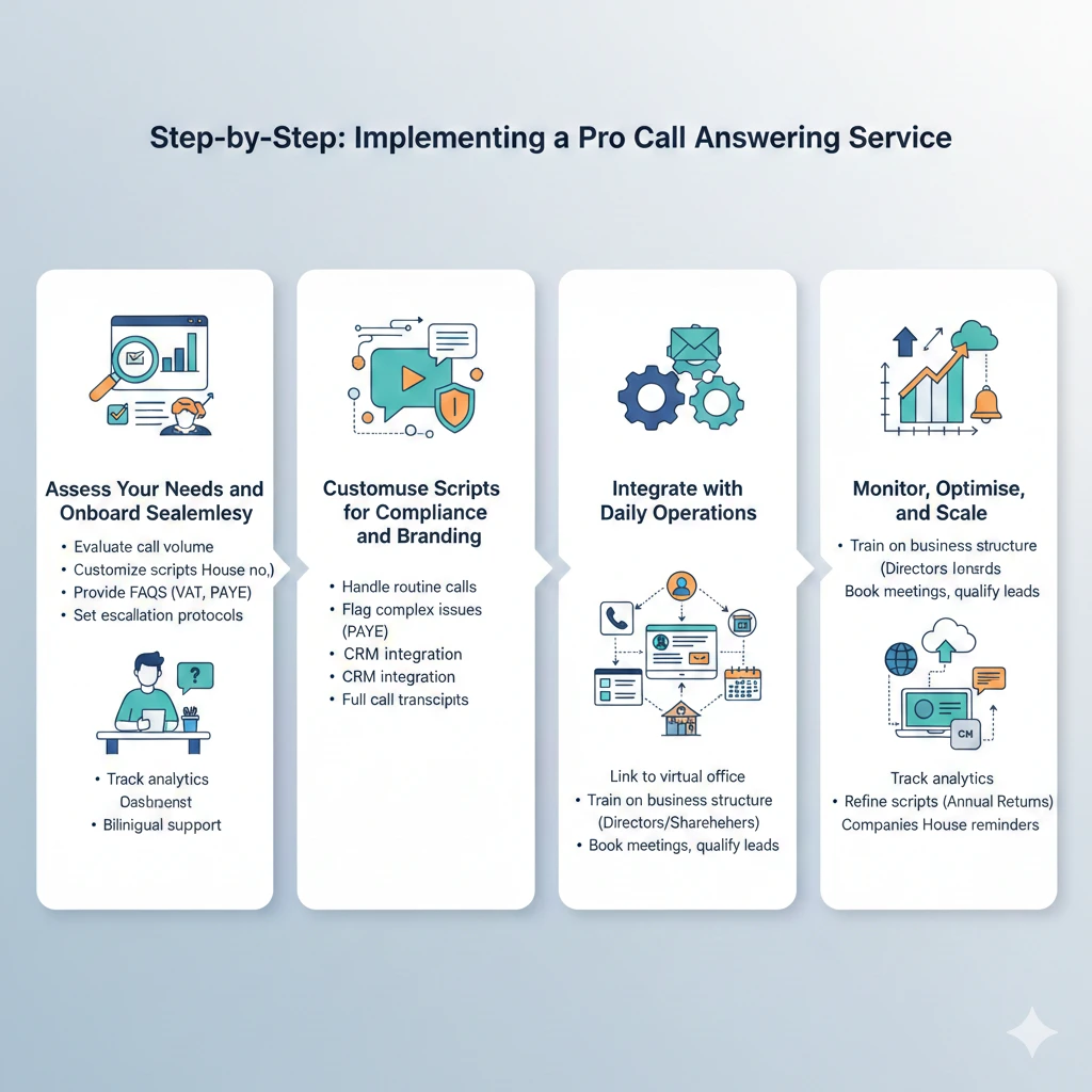 Leverage a pro call answering service strategically for optimal scaling. Start with detailed onboarding: share your Companies House documents, VAT/PAYE timelines, and director hierarchies for accurate responses. Use call whispering real-time prompts for agents to handle nuances like investor inquiries.