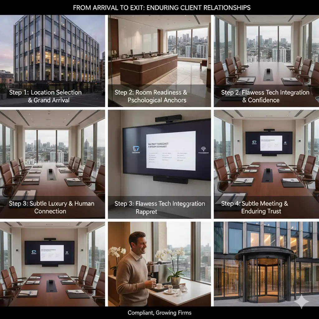 Fourth, subtle luxury details like Nespresso machines and fresh orchids humanise the space, encouraging rapport. Post-meeting, seamless billing and feedback loops reinforce reliability. This process, from arrival to exit, embeds trust, turning one-off pitches into enduring client relationships for compliant, growing firms.