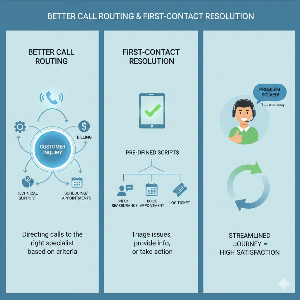 - Using predefined scripts to triage issues and decide whether to transfer, book an appointment, or log a ticket.