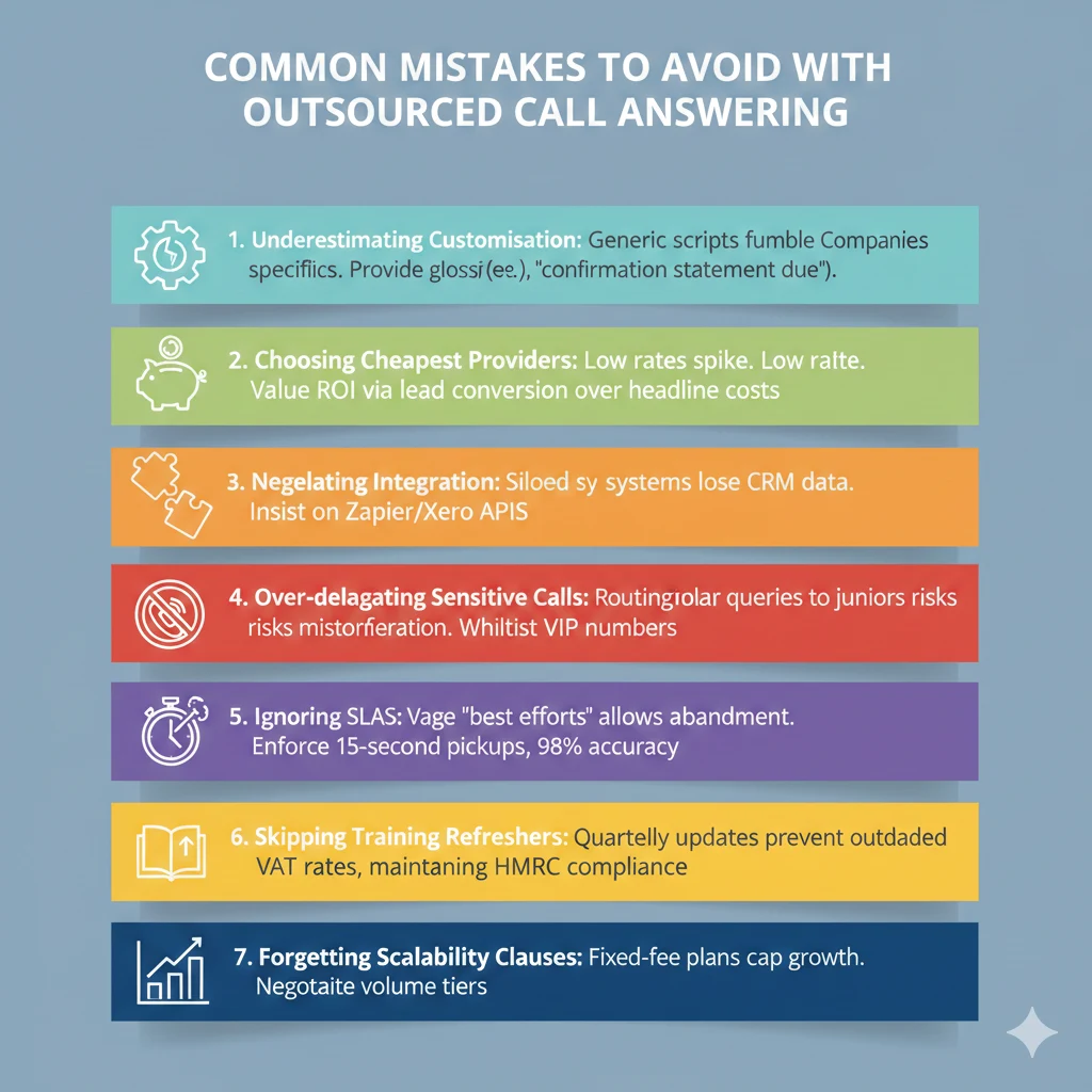 Risks include script rigidity alienating personalised service, data breaches if GDPR non-compliant (fines £17m), or over-dependence causing internal skills atrophy. Poor provider selection leads to 20% call drops, eroding trust. Mitigate with SLAs guaranteeing 95% pickup and quarterly audits.