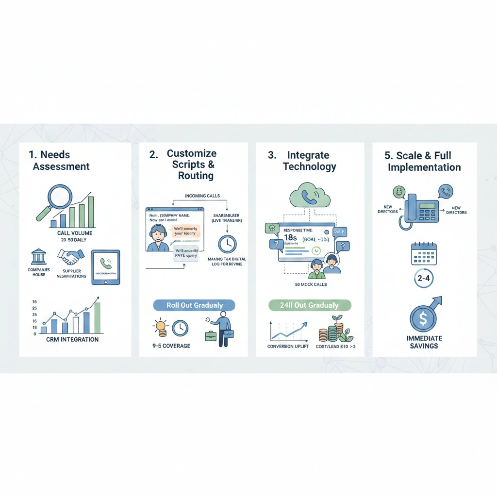 Roll out gradually: start 9-5 coverage, expand to 24/7 as PAYE payroll grows. Monitor KPIs weekly conversion uplift, cost per lead drop from £10 to £3. Scale by adding lines for new directors, achieving full implementation in 2-4 weeks with immediate savings.