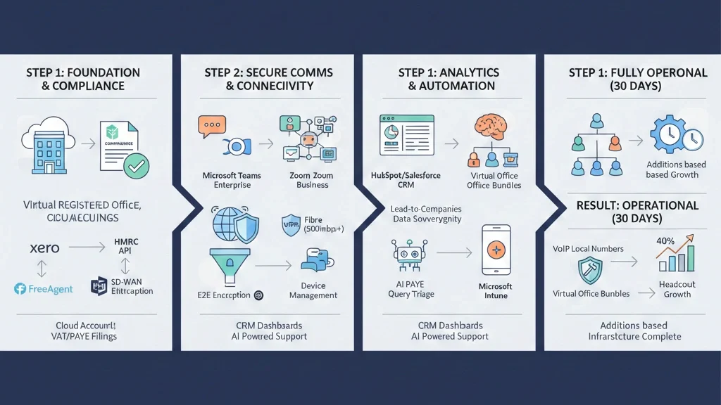 Scale iteratively: add VoIP local numbers via virtual office bundles, cybersecurity (CrowdStrike) as headcount grows. Full stack operational in 30 days, yielding 40% efficiency gains.