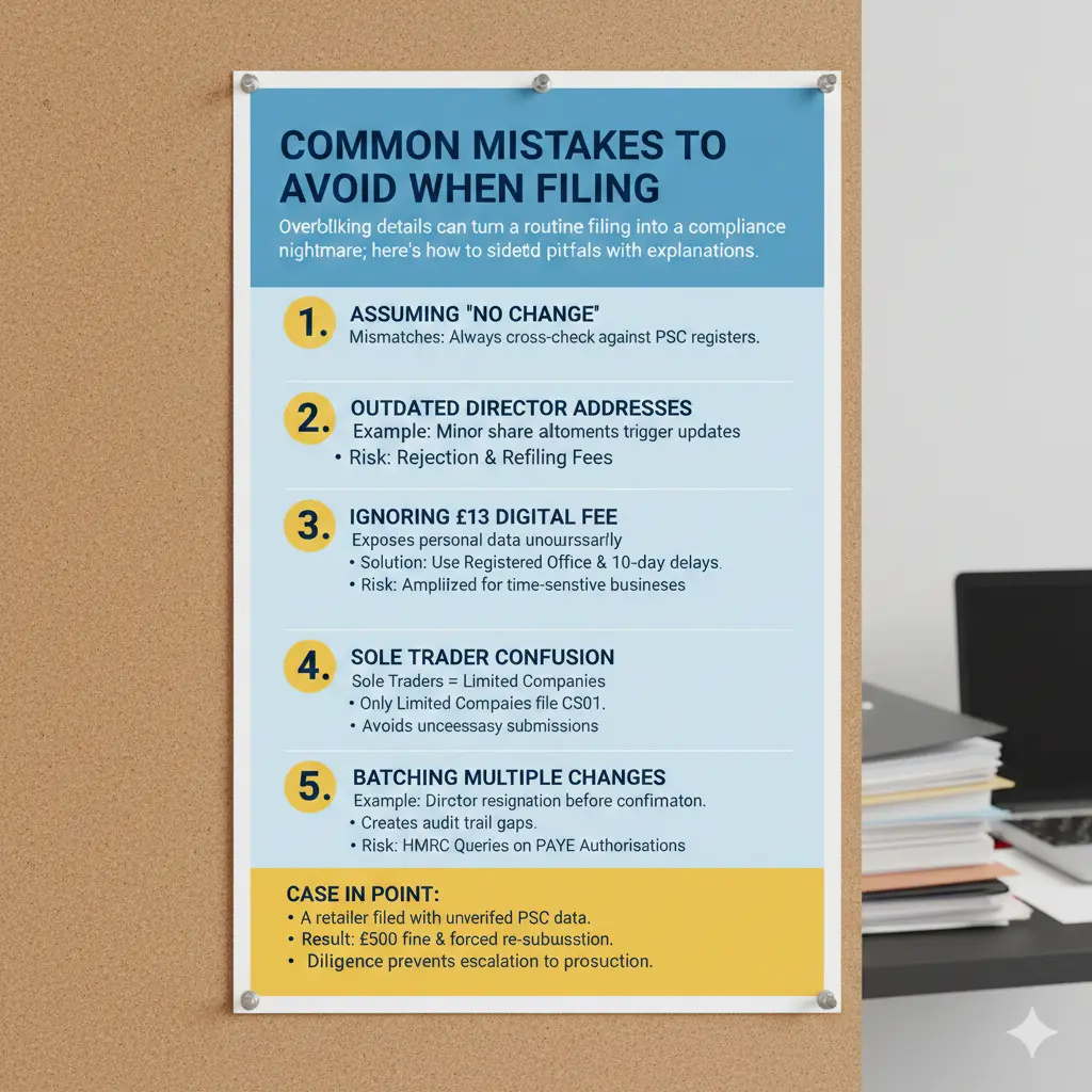 Third, ignoring the £13 digital fee by posting incurs £40 costs and delays (up to 10 days), amplifying risks for time-sensitive businesses. Fourth, sole traders confusing this with self-assessment miss that only limited companies file CS01, leading to unnecessary submissions. Finally, batching multiple changes without interim filings (e.g., director resignation before confirmation) creates audit trails gaps, inviting HMRC queries on PAYE authorisations.