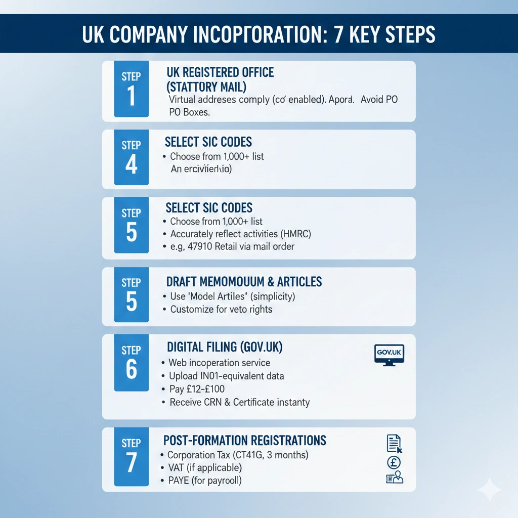 Step 3: Designate a UK-registered office for statutory mail—virtual addresses comply if c/o-enabled. Avoid PO Boxes.