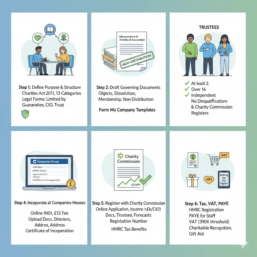 This process blends legal compliance with strategic foresight. Professional support from Form My Company ensures filings meet Companies Act and Charity Commission criteria on the first submission, saving months of revisions.