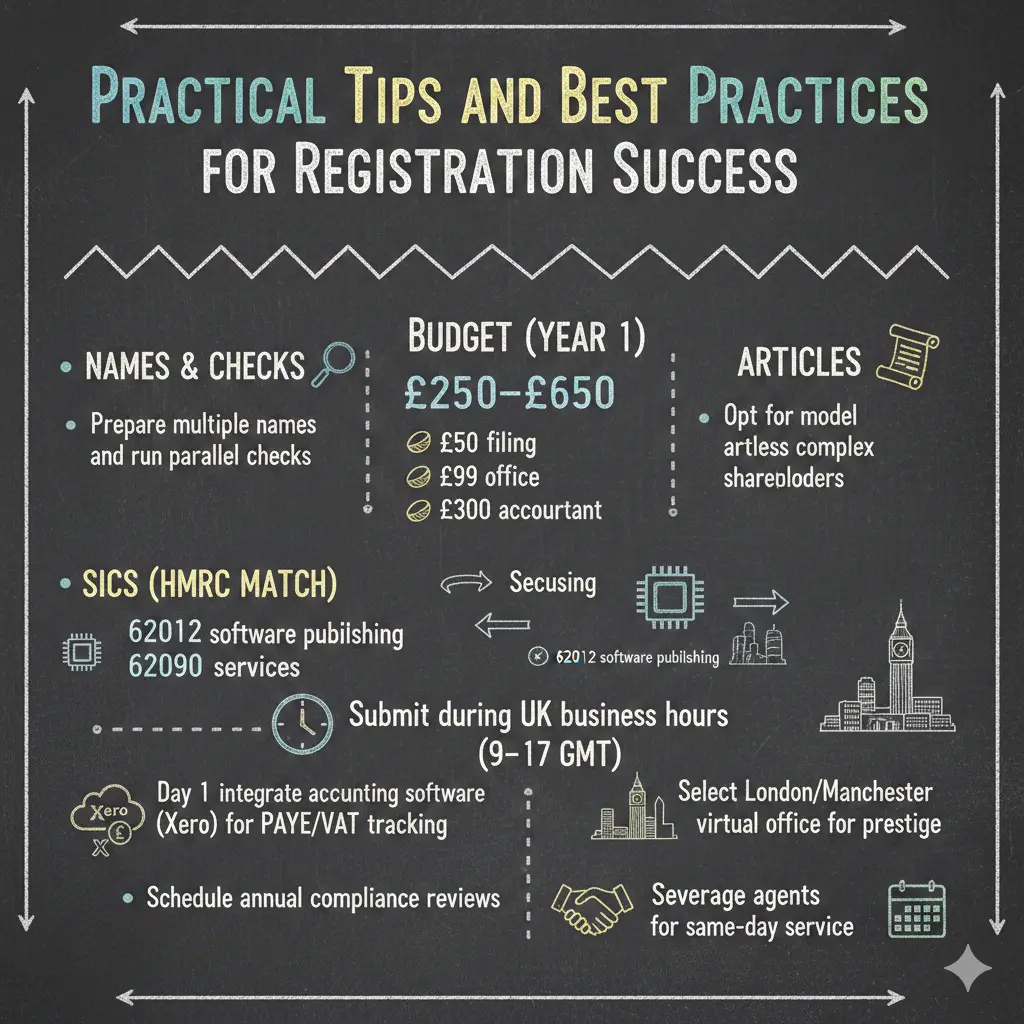 Prepare multiple names and run parallel checks. Budget £250–£650 Year 1 (£50 filing, £99 office, £300 accountant). Opt for model articles unless complex shareholders. Choose precise SICs matching HMRC (62012 software publishing vs 62090 services). Submit during UK business hours (9–17 GMT). Day 1 integrate accounting software (Xero) for PAYE/VAT tracking. Select London/Manchester virtual office for prestige. Schedule annual compliance reviews. Leverage agents for same-day service.