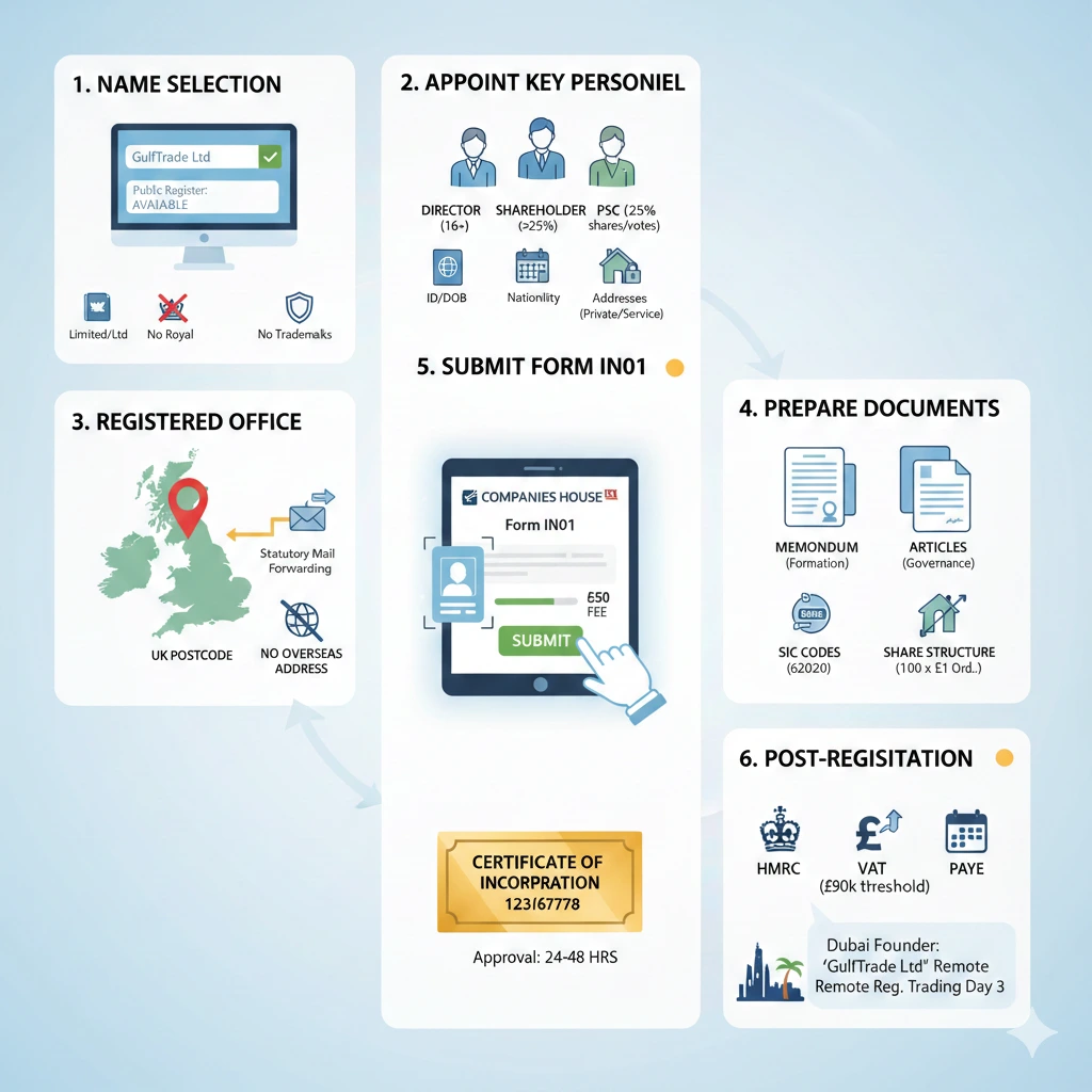 Post-registration: Notify HMRC for Corporation Tax UTR, assess VAT (£90k threshold), initiate PAYE. A Dubai founder registers “GulfTrade Ltd” remotely, trading Day 3.