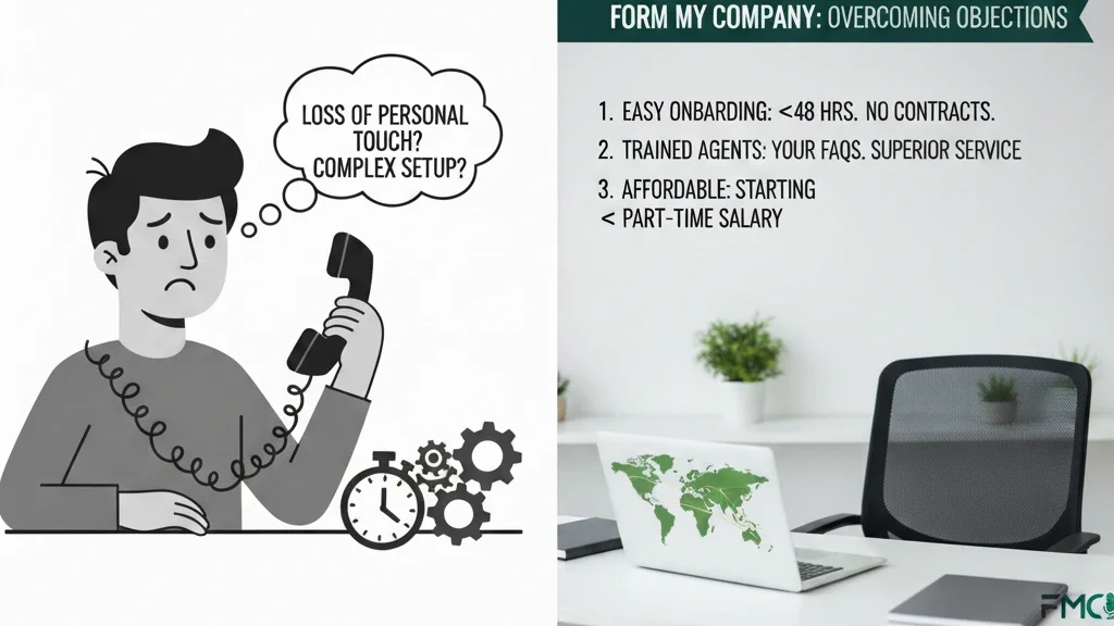 Skeptics worry about losing personal touch or setup complexity, but Form My Company eases onboarding in under 48 hours. No contracts lock you in; scale up or pause as needs evolve. Agents train on your FAQs and preferences, delivering responses indistinguishable from in-house staff often superior due to specialized skills.