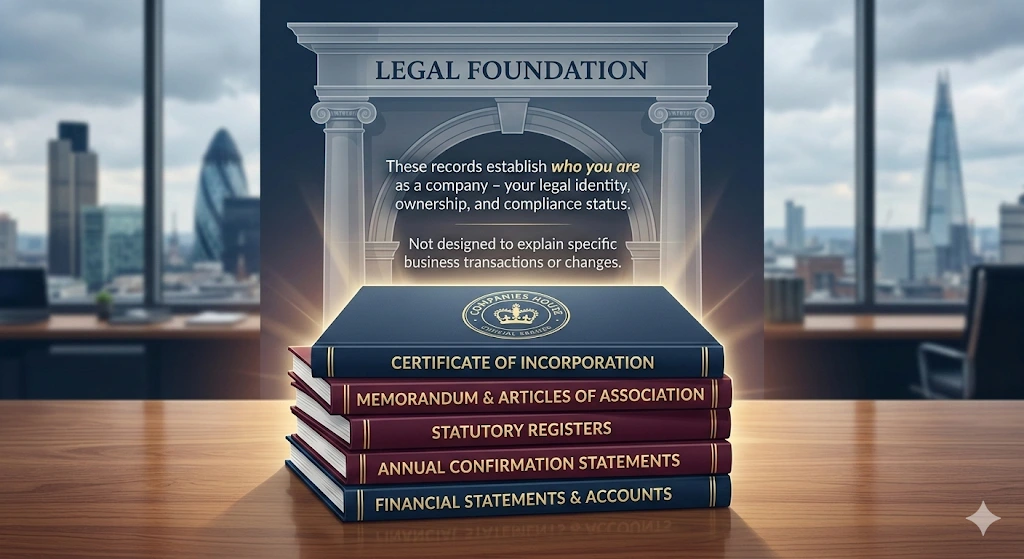 Standard company records form the foundation of legal compliance for any UK-registered business. These records are mandated by UK company law and monitored by Companies House.