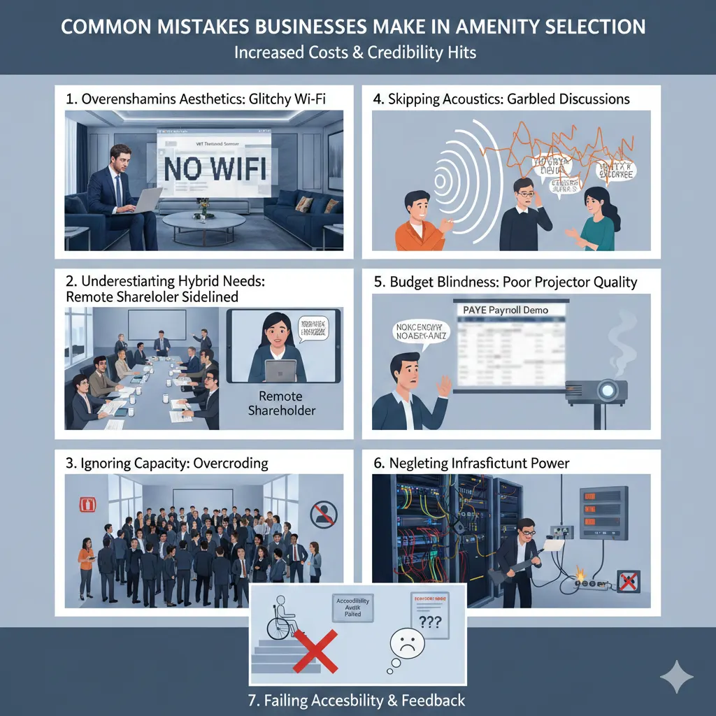 Overemphasising aesthetics neglects functionality—one flashy room with glitchy Wi-Fi derails a critical VAT threshold seminar, frustrating attendees and delaying HMRC registrations. Underestimating hybrid needs leaves remote shareholders sidelined, misaligning on PSC notifications. Ignoring capacity fluctuations cram sessions, breaching fire regs and comfort standards under HSE guidelines.
