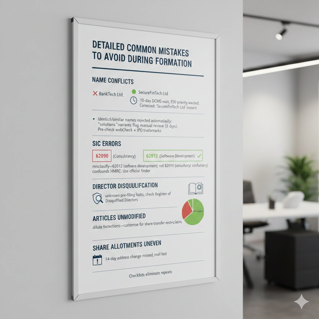 Mistake 1: Poor name selection—filing “TechLtd” when “Tech Limited” exists triggers instant rejection under s.66 Companies Act. Sensitive terms like “Royal” require DCMS approval (5-10 days delay).