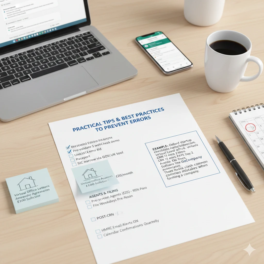 Example: Oxford startup checklists name/SIC/directors, virtual Leeds office—CRN 15 mins, PAYE Day 2. Avoids £2k fines. Software like GoCompany automates. These habits slash common mistakes when forming a company.