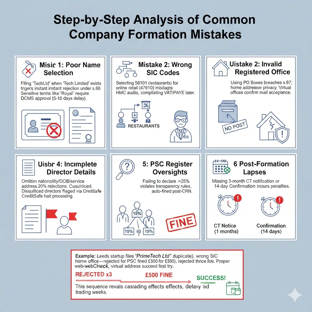 Example: Leeds startup files “PrimeTech Ltd” (duplicate), wrong SIC 62090, home office—rejected thrice (£36 lost), fined £500 for PSC. Proper webCHeck, SIC finder, virtual address succeed first try. This sequence reveals cascading effects, delaying trading weeks.