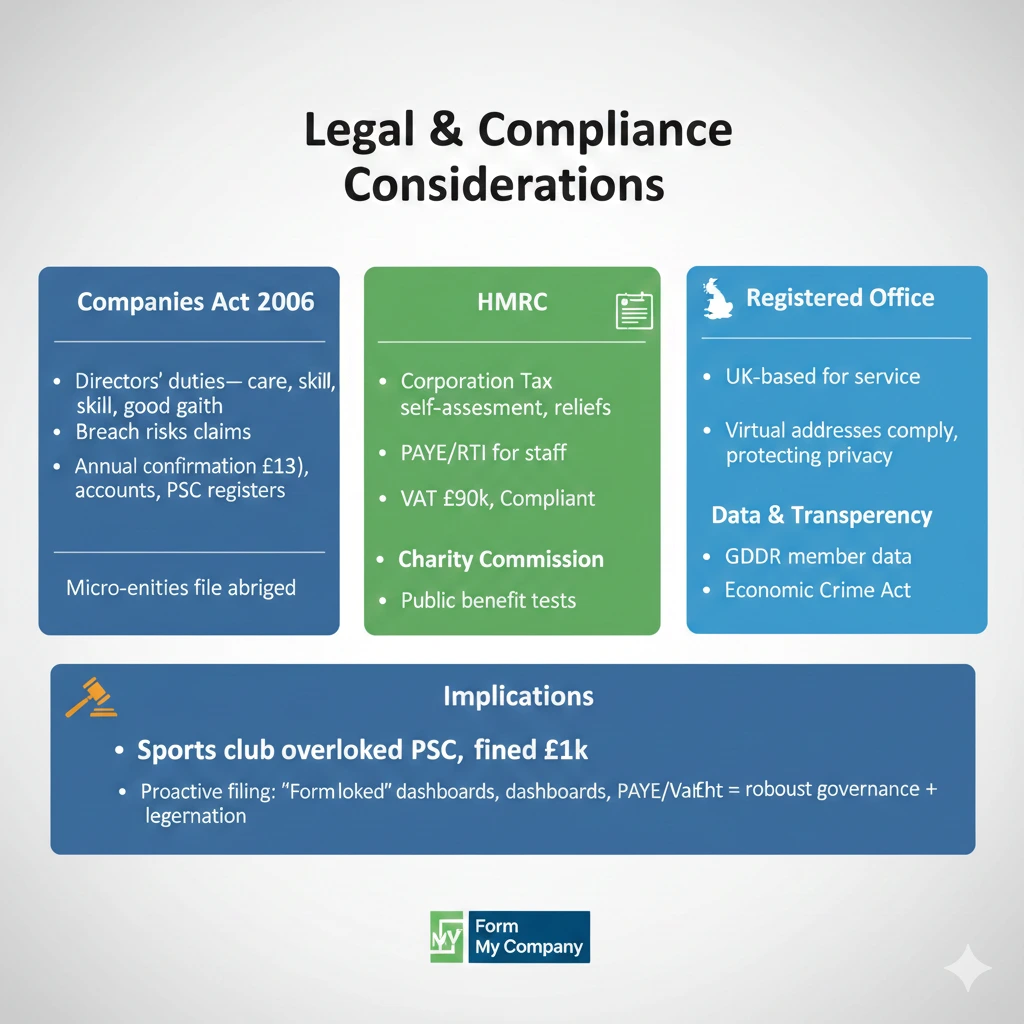 Registered office must be UK-based for service—virtual addresses comply, protecting privacy. GDPR binds member data; Economic Crime Act demands transparency.