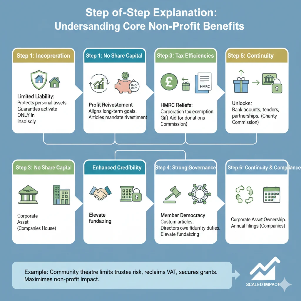 Limited liability tops the list: unlike sole traders, members risk only guarantees, crucial for volunteer-led charities facing lawsuits. Tax perks compound: s.257 ICTA 1988 exempts profits; charitable status adds rates relief and payroll giving. Credibility draws donors—public registers build trust, evidenced by 80% of major UK charities using this form.