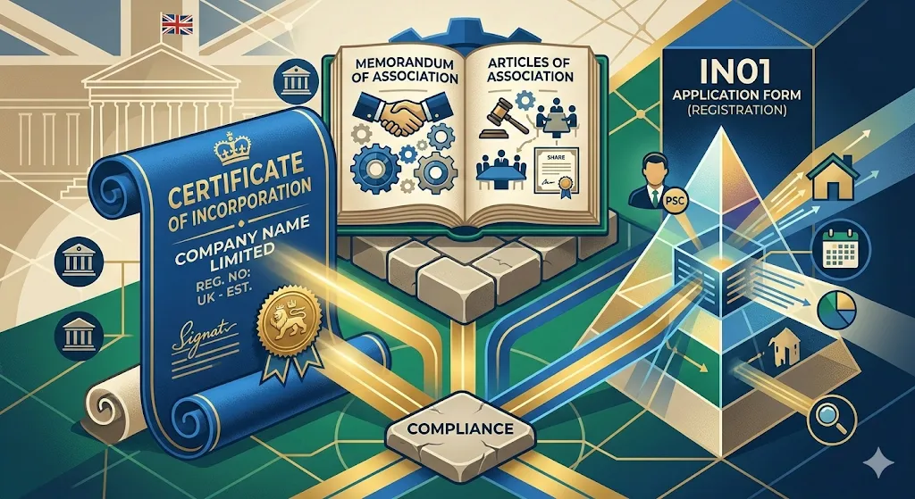 The Certificate of Incorporation stands as the cornerstone of any UK Company Pack. Issued by Companies House upon successful registration, this official document confirms the company’s legal existence from the incorporation date. It lists the company name, number, registered office address, and type—typically private limited by shares.