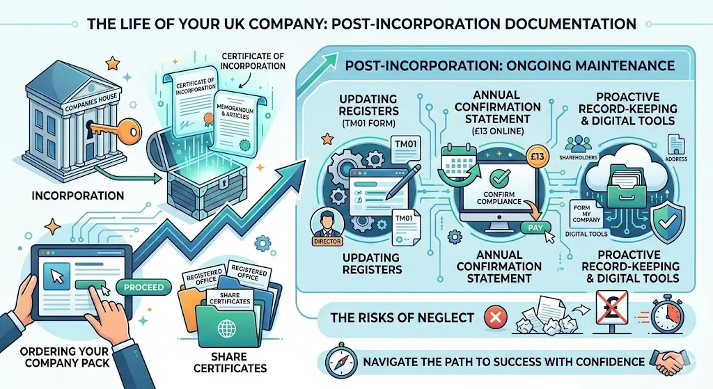 Post-setup, update registers for changes like new directors via TM01 forms. Annual Confirmation Statements confirm ongoing compliance, costing £13 online.