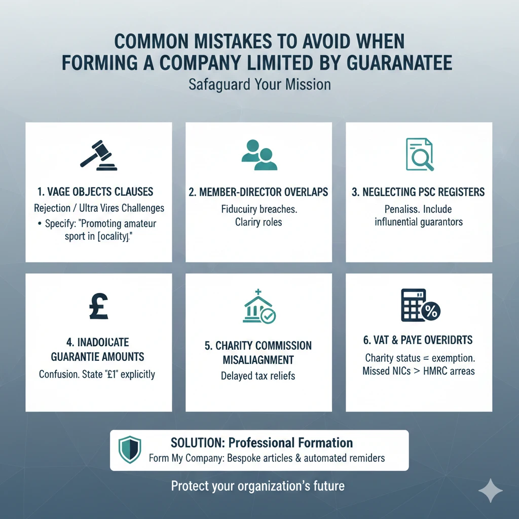 A frequent error is vague objects clauses, leading to Companies House rejection or later ultra vires challenges—specify precisely, e.g., “promoting amateur sport in [locality].” Overlooking member-director overlaps risks fiduciary breaches; draft articles clarifying roles. Neglecting PSC registers invites penalties; even guarantors with influence qualify.