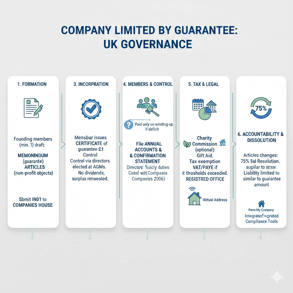 Upon submission via the IN01 form online—often facilitated by services like Form My Company—the Registrar issues a certificate of incorporation, assigning a unique company number. Members, akin to shareholders but without ownership rights, agree to contribute their guarantee sum (e.g., £1) only if winding-up occurs and assets fall short. No shares exist, so control vests in directors elected by members, typically via annual general meetings (AGMs). Day-to-day, the company files annual accounts and confirmation statements with Companies House, mirroring private limited companies but with adaptations for non-profits.