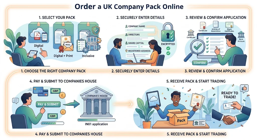 You can order a Company Pack online with Form My Company by selecting your preferred pack level, entering your company details, and completing a secure payment through their online portal. Form My Company then submits the IN01 application to Companies House, handles the registration fees, and delivers your Company Pack digitally or by post, depending on the package you choose.