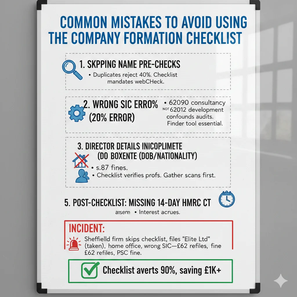 Incident: Sheffield firm skips checklist, files “Elite Ltd” (taken), home office, wrong SIC—£62 refiles, £500 PSC fine. Checklist averts 90%, saving £1k+.