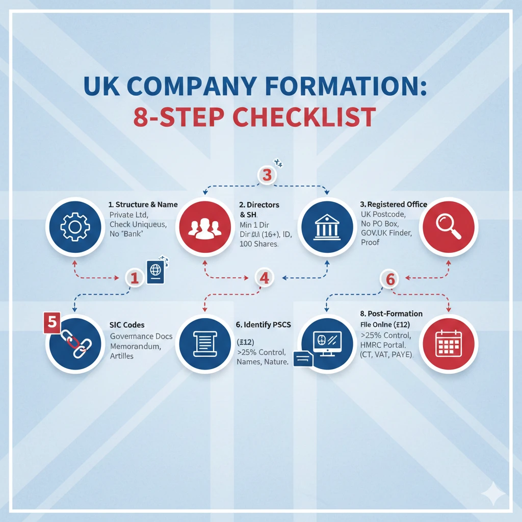 Name check, director/shareholder details, registered office proof, SIC codes, memorandum/articles, PSC register, filing confirmation. Post: HMRC registrations.