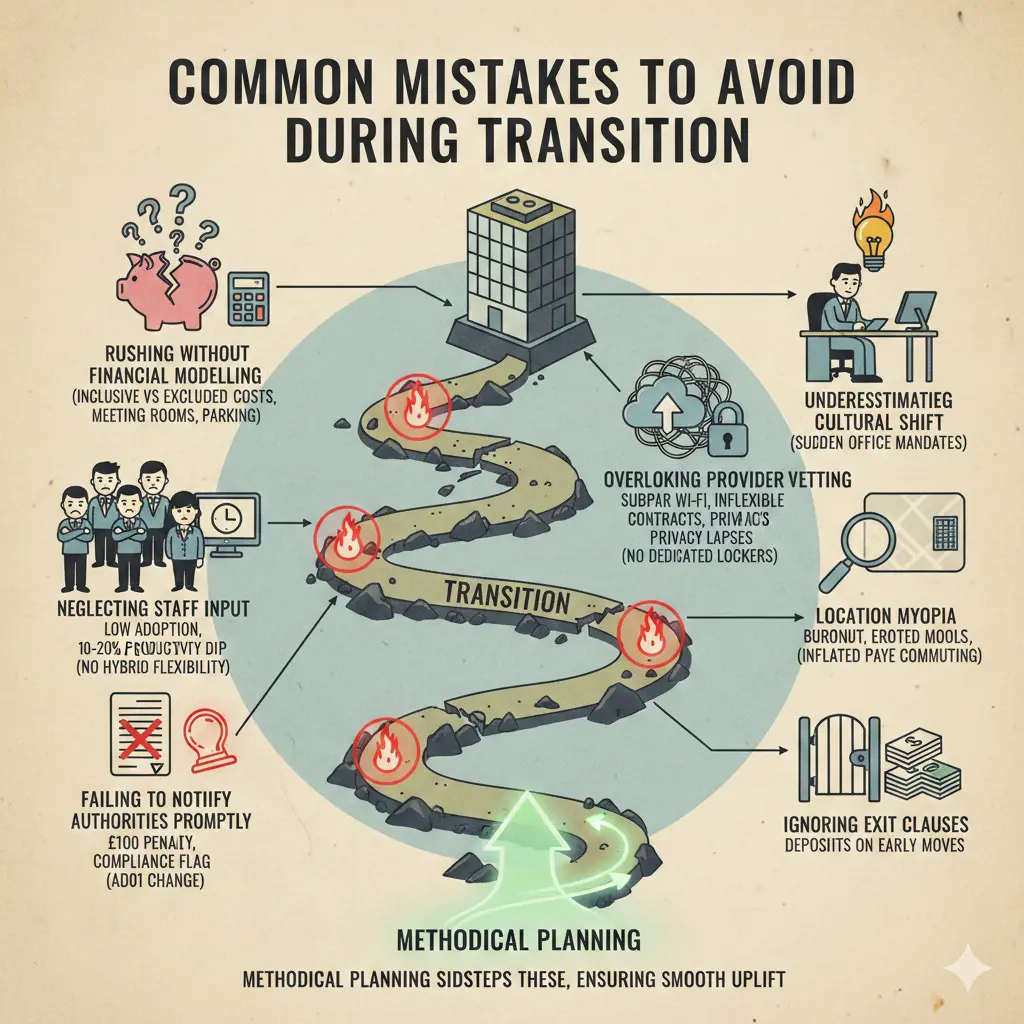 Rushing without financial modelling trips up many: overlooking inclusive vs excluded costs leads to 15-25% budget shocks, especially when adding meeting room credits or parking. Neglecting staff input risks low adoption teams resenting the commute without hybrid flexibility see productivity dip 10-20%. Failing to notify authorities promptly incurs late fees; one overlooked AD01 change triggered a £100 penalty and compliance flag.