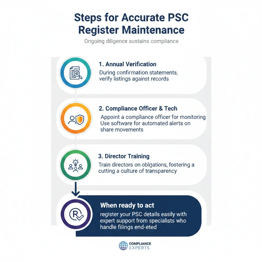 Maintaining an accurate PSC Register starts with thorough due diligence during setup or changes. Directors bear personal liability for inaccuracies, so systematic checks prove indispensable.