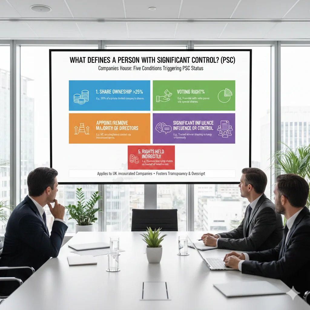 A PSC represents anyone meeting specific thresholds of ownership or control, designed to capture real decision-makers rather than nominal shareholders. Companies House defines five conditions triggering PSC status, each rooted in quantifiable metrics for clarity and enforceability.