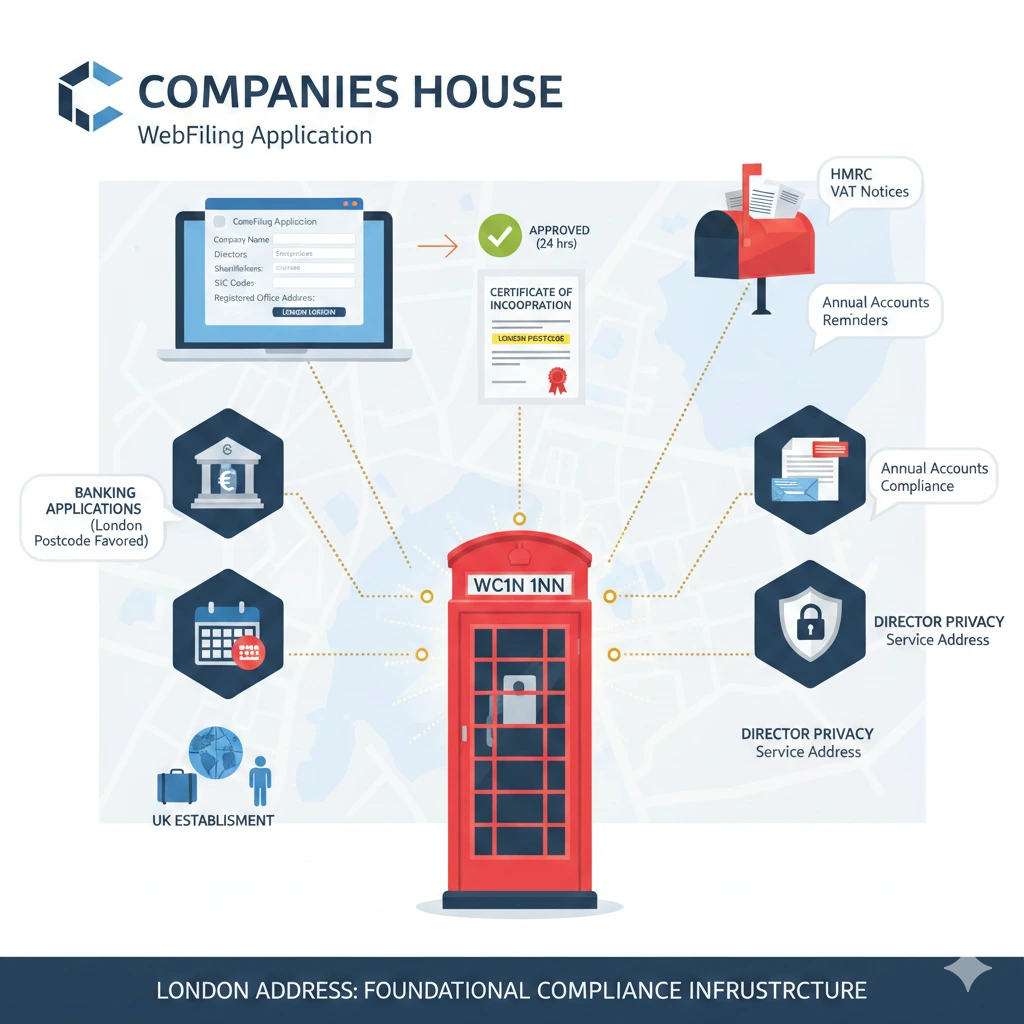 For practical setup, formation agents or virtual office services verify the address qualifies as a physical location capable of handling official correspondence no PO boxes allowed. Directors can use it as their service address for privacy, shielding home details while maintaining transparency for PSCs. Post-formation, it supports banking applications, where high-street lenders favour London postcodes, and integrates with PAYE/VAT registrations by providing a stable hub. Non-residents benefit most, pairing it with remote incorporation to meet “UK establishment” rules. This step-by-step integration turns a simple postal choice into foundational compliance infrastructure.