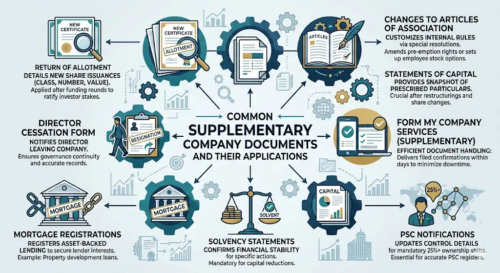 Supplementary company documents are additional filings with Companies House, such as returns of allotment, changes to articles of association, and statements of capital, required for events like share issuances or governance updates. They ensure compliance under the Companies Act 2006 beyond standard incorporation records. Form My Company handles these to maintain accurate public registers.